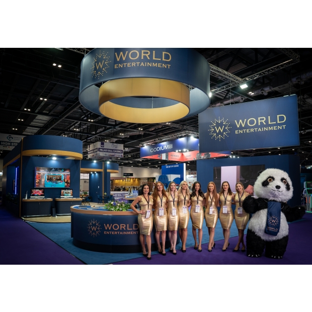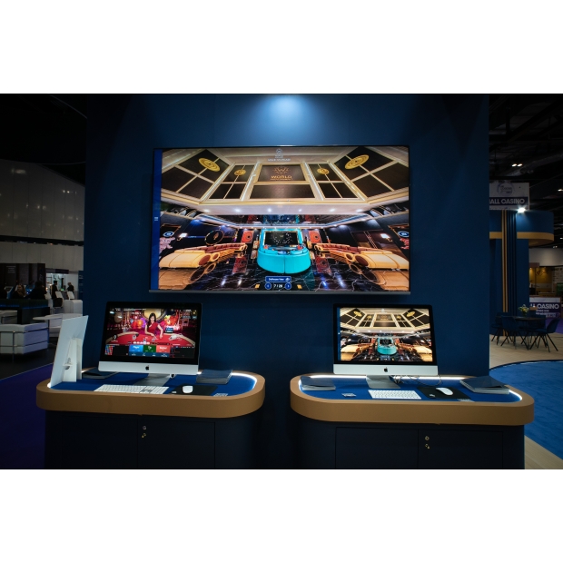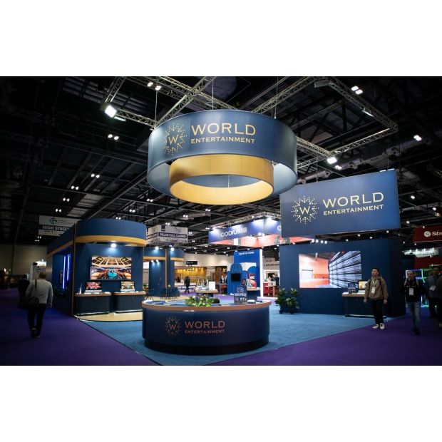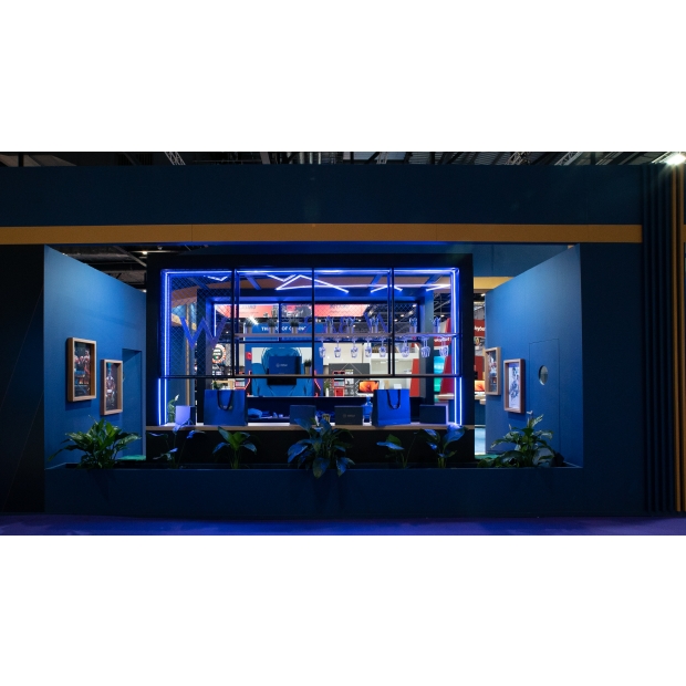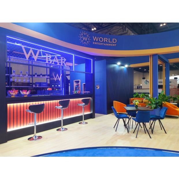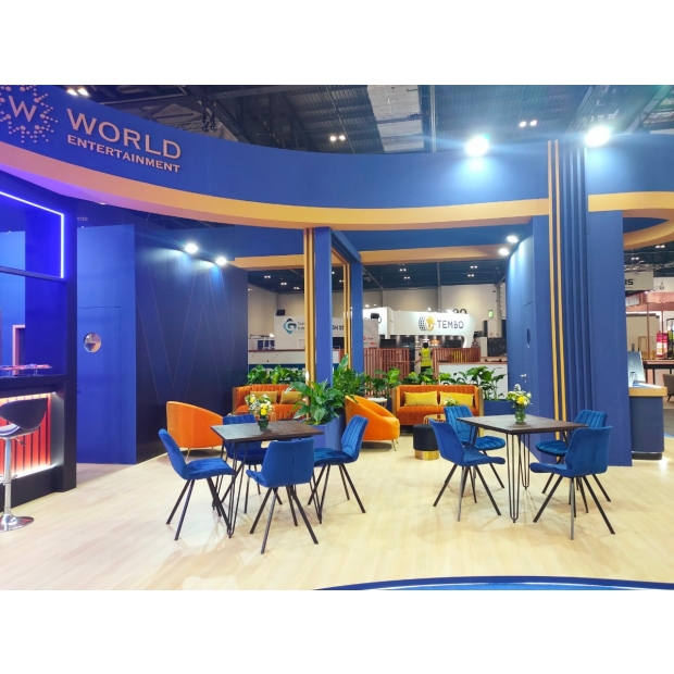 亞洲指標性娛樂線上品牌 - WE,在這次ICE LONDON展位中,融合「低調奢華」與「沈穩大氣」的空間語感,展現出品牌進軍國際的格局與自信。整體以深藍為主軸、金色點綴,傳遞穩重、尊榮的基調,並巧妙加入跳色的愛馬仕橘沙發,在冷調中注入一抹鮮明生命力,瞬間吸引視線,也象徵品牌的創新與能量。